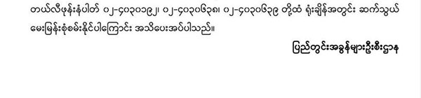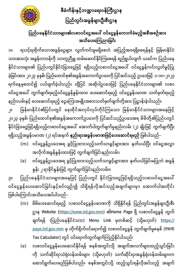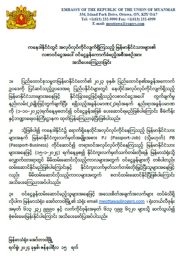 ကနေဒါနိုင်ငံတွင် အလုပ်လုပ်ကိုင်လျက်ရှိကြသည့် မြန်မာနိုင်ငံသားများ၏ လစာဝင်ငွေအပေါ် ဝင်ငွေခွန်ကောက်ခံမည့်အစီအစဉ်အားအသိပေးကြေညာခြင်း