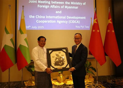 ဒုတိယဝန်ကြီးချုပ်နှင့် နိုင်ငံခြားရေးဝန်ကြီးဌာန၊ ပြည်ထောင်စုဝန်ကြီးဦးဆောင်သည့် ကိုယ်စားလှယ်အဖွဲ့နှင့် တရုတ်နိုင်ငံတကာဖွံ့ဖြိုးမှုပူးပေါင်းဆောင်ရွက်ရေးအေဂျင်စီ (CIDCA) ဥက္ကဋ္ဌ ဦးဆောင်သည့်ကိုယ်စားလှယ်အဖွဲ့တို့ တွေ့ဆုံဆွေးနွေး (၂၄-၇-၂၀၂၅ ရက်၊ နေပြည်တော်)