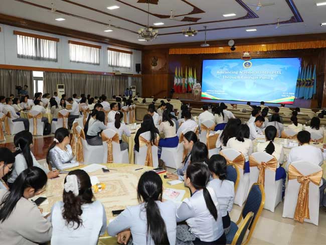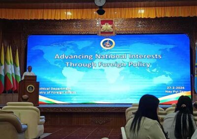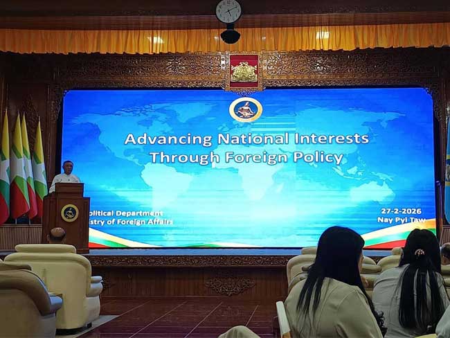 နိုင်ငံခြားရေးဝန်ကြီးဌာန၊ နိုင်ငံရေးရာဦးစီးဌာနက “နိုင်ငံခြားရေးမူဝါဒဖြင့် အမျိုးသားအကျိုး စီးပွားကိုဖော်ဆောင်ခြင်း”(Advancing National Interests through Foreign Policy) ခေါင်းစဉ်ဖြင့် အလုပ်ရုံဆွေးနွေးပွဲတစ်ရပ်ကို ၂၀၂၆ ခုနှစ်၊ ဖေဖော်ဝါရီလ ၂၇ ရက် (သောကြာနေ့) တွင် နိုင်ငံခြားရေးဝန်ကြီးဌာန၊ လောကနတ်ခန်းမ၌ ကျင်းပသည်။