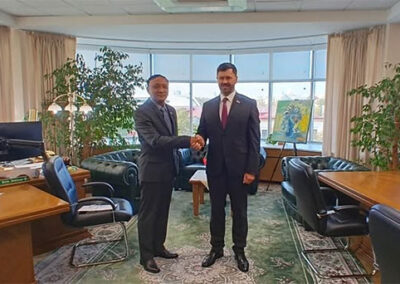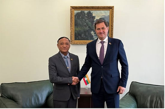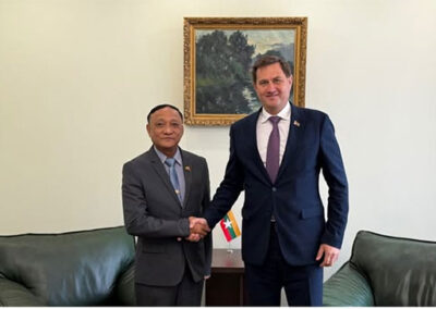 H.E. U Ko Ko Kyaw, Deputy Minister for Foreign Affairs of the Republic of the Union of Myanmar, who is in Minsk to co-chair the Second Round of Myanmar–Belarus Bilateral Consultations between the Ministries of Foreign Affairs of Myanmar and Belarus, held separate meetings with H.E. Mr. Maxim Ryzhenkov, Minister of Foreign Affairs of the Republic of Belarus and H.E. Mr. Sergey Lukashevich, First Deputy Minister of Foreign Affairs of the Republic of Belarus at the Ministry of Foreign Affairs of Belarus. They cordially exchanged views on further promoting bilateral relations and cooperation in various sectors including education, science and technology, sports, and tourism.