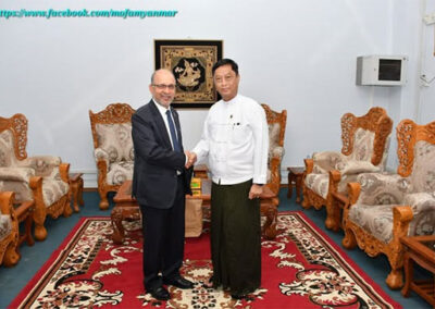 During the meeting, they cordially discussed matters pertaining to cooperation on reconstruction in the affected areas following the Mandalay earthquake. They also exchanged views on enhancing cooperation in areas of mutual interest and agreed to continue working together to further strengthen the friendly relations between the two countries.