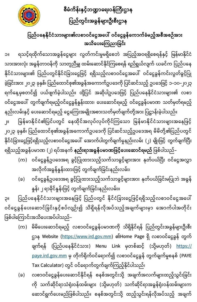 ပြည်ပနေနိုင်ငံသားများ၏ လစာဝင်ငွေအပေါ် ဝင်ငွေခွန်ကောက်ခံမည့်အစီအစဉ်အား အသိပေးအ​ကြောင်းကြားခြင်း