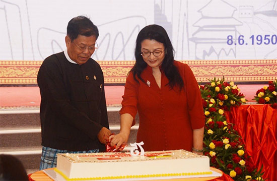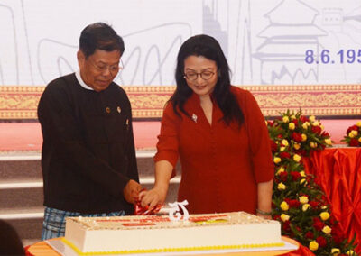 The Deputy Prime Minister and the Union Minister for Foreign Affairs of Myanmar and the Chinese Ambassador later cut the commemorative Diamond Jubilee Cake. After that, the Deputy Prime Minister and the Union Minister for Foreign Affairs of Myanmar posed for a group photo with the dignitaries attending the reception.