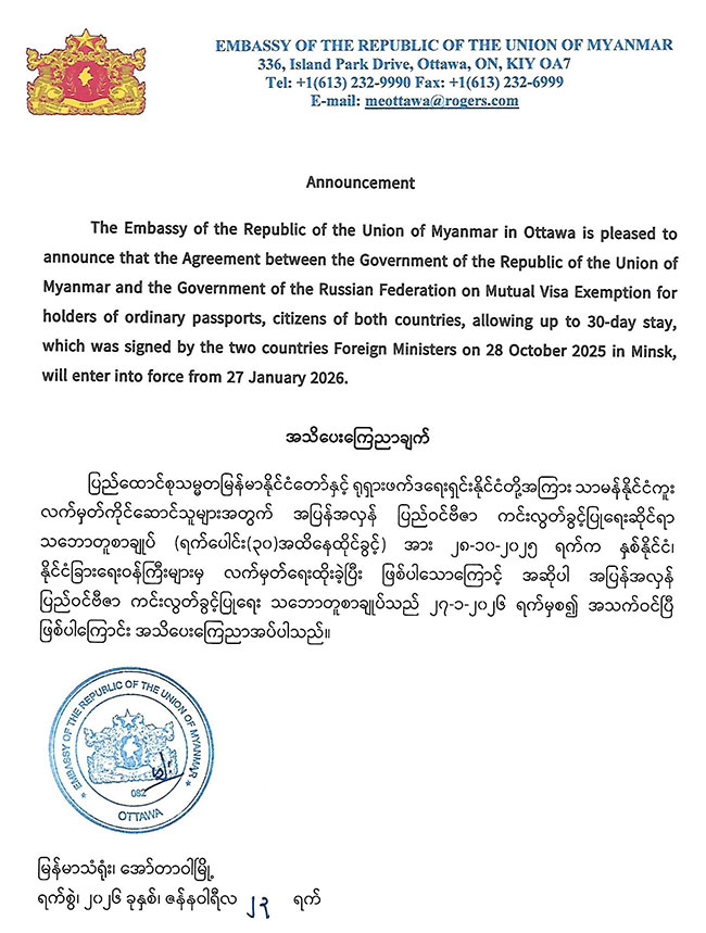 Announcement on Mutual Visa Exemption for Citizens of Myanmar and Russia