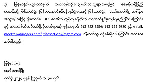 ကနေဒါနိုင်ငံသို့ ရောက်ရှိလာသည့် မြန်မာနိုင်ငံသားများအား အော်တာဝါမြို့ရှိ မြန်မာသံရုံးသို့ စာတိုက် (သို့မဟုတ်) အီးမေးလ်မှတစ်ဆင့် ရောက်ရှိကြောင်း သတင်းပေးပို့ပါရန် မေတ္တာရပ်ခံအပ်ပါသည်-